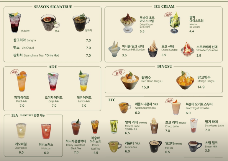든든한 한 끼를 원한다면 브런치 메뉴를 추천합니다. 알리오 올리오 파스타, 그릴드 치즈 샌드위치, 잠봉뵈르 베이글 샌드위치 등 전문 레스토랑 못지않은 퀄리티의 브런치 메뉴를 합리적인 가격에 즐길 수 있습니다. 신선한 재료를 아낌없이 사용한 샐러드와 샌드위치는 가벼우면서도 든든한 식사로 손색이 없습니다.