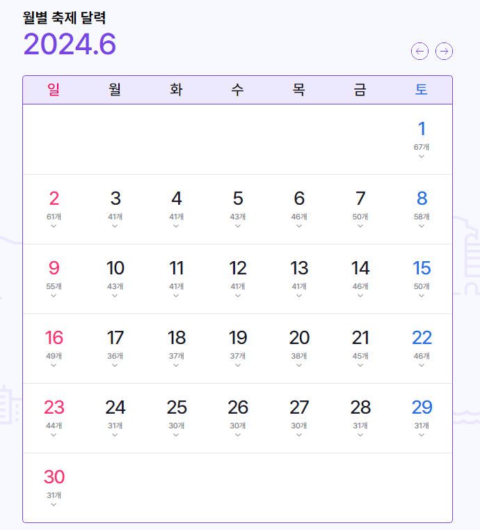 월별 축제 달력 기능을 통해 원하는 날짜에 어디에서 어떤 축제가 열리는지 손쉽게 찾아볼 수 있습니다.