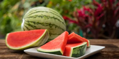 수박은 92%가 수분으로 이루어져 있어 더운 여름에 수분을 충분히 보충하는 데 도움이 됩니다. 또한, 리코펜이 풍부하게 함유되어 있어 항산화 작용과 피부 건강에 좋습니다.