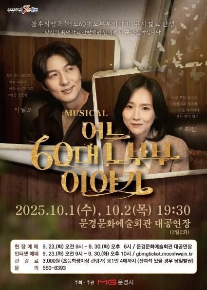 인생의 마지막 순간까지 이어지는 두 사람의 아름다운 사랑과 그 속에 담긴 애환은 우리 모두의 이야기이기도 합니다. 이번 가을, 부모님의 손을 잡고, 혹은 사랑하는 이와 함께 공연장을 찾아보는 것은 어떨까요? 평범한 일상 속에서 서로가 얼마나 소중한 존재인지를 확인하는 따뜻하고 의미 있는 시간이 될 것입니다. 문경의 가을밤을 감동으로 물들일 뮤지컬 '어느 60대 노부부 이야기'에 여러분을 초대합니다.