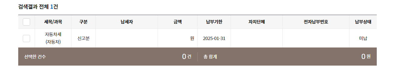 해당란을 선택하면 내가 납부해야 할 자동차세의 금액과 납부기한, 전자납부번호를 확인하실 수 있습니다.