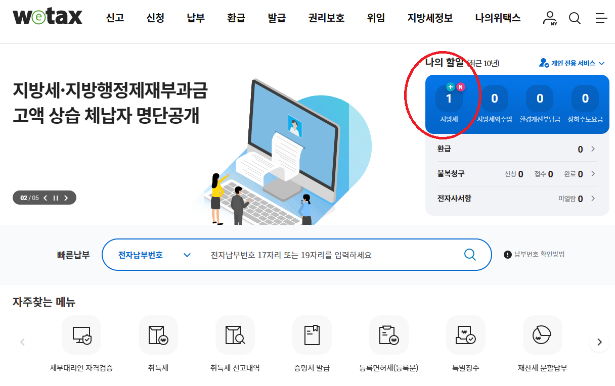 계정 로그인을 할 경우 나의 할일 메뉴에 지방세 탭이 '1'로 활성화 되어있습니다.